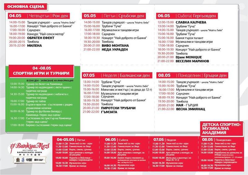На Гергьовден ви очакват рекорден брой чевермета, които ще бъдат приготвени от най-изкусните майстори готвачи на Балканите на големия Гергьовденски маратон на 6 май. Празничната програма стартира с безплатен концерт на Славка Калчева в парк „Ротонда“ в 12 часа на обяд. Един от най-успешните ни модели Гери Дончева и Георги Енчев от известният дует - Румънеца и Енчев ще посрещнат именните си дни на фестивала в Банкя, на който ще бъдат и водещи. За всички гости и посетители на феста на балканската скара, празникът ще продължи с прославения сръбски оркестър за духова музика „Гуча“, а вечерта ди-джей сет на Джейн Моник със златните хитове на българската естрада. Любимецът на публиката Веселин Маринов също ще изпее много от хитовете си на Гергьовден. Всички концерти на фестивала са с вход свободен, включително и тези на някои от най-добрите балкански изпълнители, като Неда Украден, Весна Змиянац и Ная. Атрактивни състезания, като надяждане с люти чушки и с кебапчета, както и турнири по белот, табла, туистър, футболен билярд, биърпонг и състезания с радиоуправляеми колички също ще забавляват посетителите. За участниците ще има над 1000 парични и предметни награди.