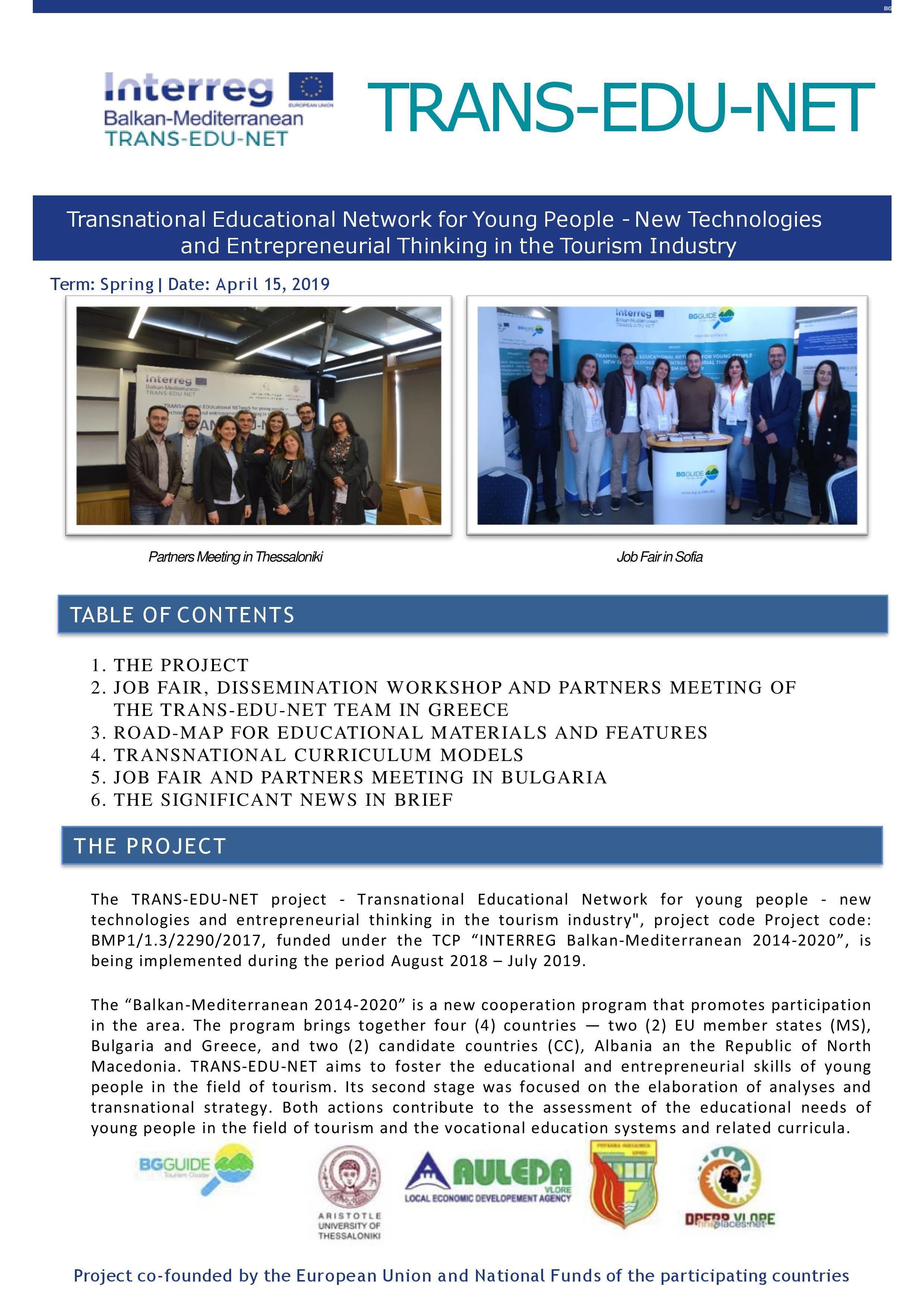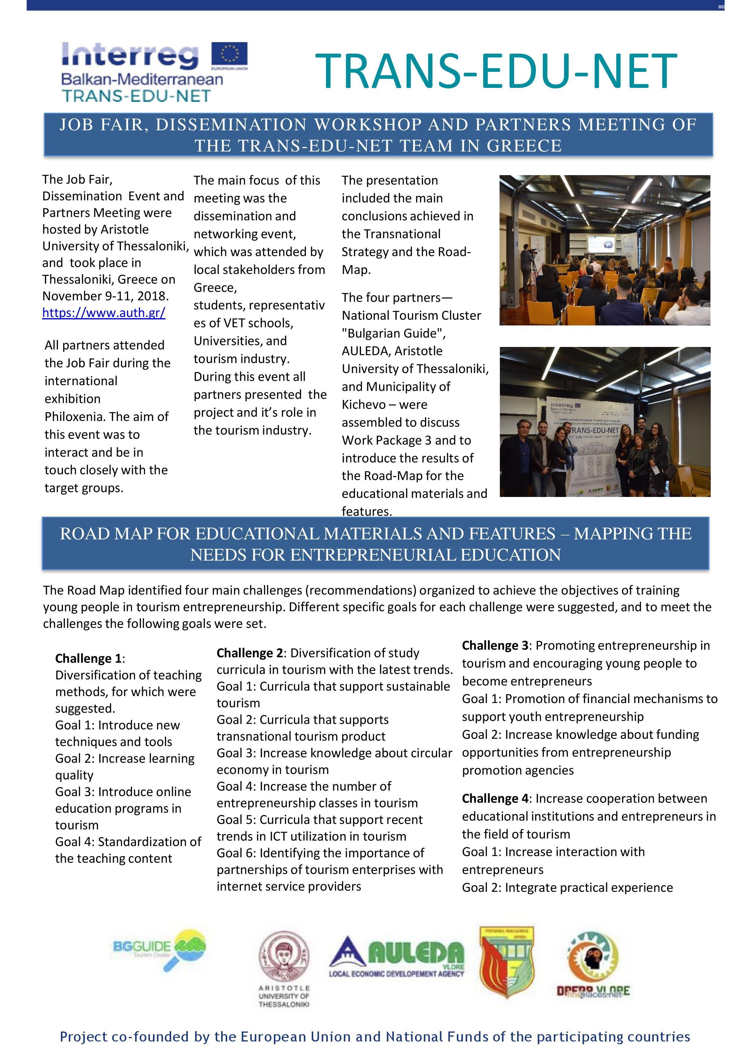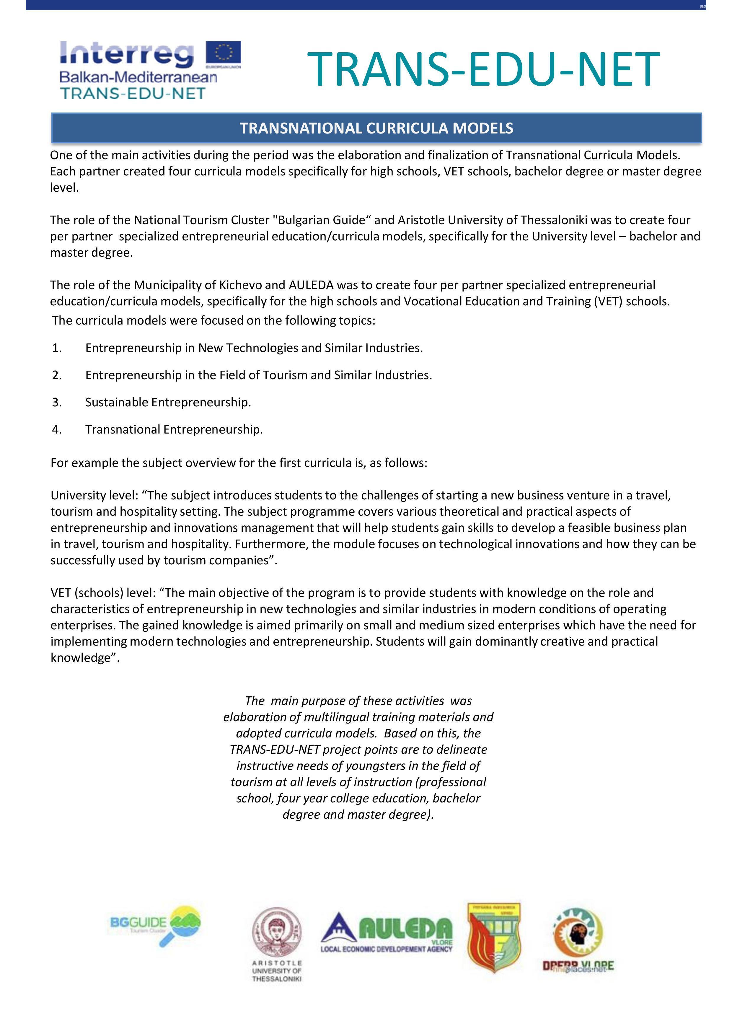 Ролята на Национален туристически клъстер "Българският пътеводител" (България) и Солунския университет "Аристотел" (Гърция) беше да разработят по четири специализирани учебни програми за предприемачество, предназначени за университетско ниво.