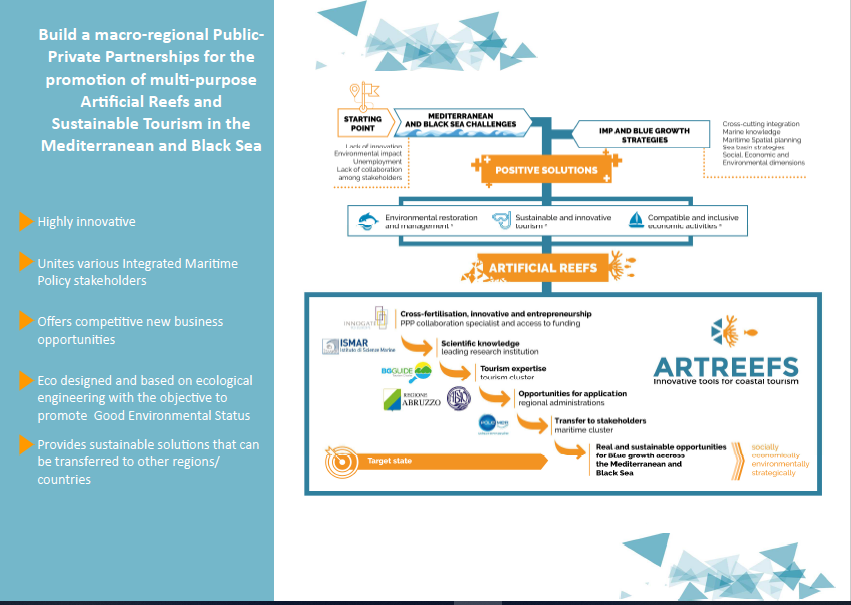 Проектът "ArtReefs" има за цел да промотира идеята за иновативни изкуствени рифове като универсален инструмент за справяне със съществуващите предизвикателства в регионите на Средиземно и Черно море, а именно влошаването на околната среда и конфликтите между потребителите на крайбрежните зони.